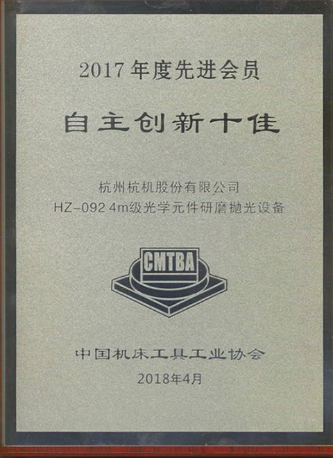 2018年4月,中國(guó)機床工具工業協會開展了2017年度中國機床工具工業協會先進會員(yuán)(十佳)表彰活動,我公司憑借“HZ-092 4米級(jí)光學元件研(yán)磨拋光設備”項目榮(róng)獲2017年度中國機床工具工業協會“自主創新十佳”稱號。